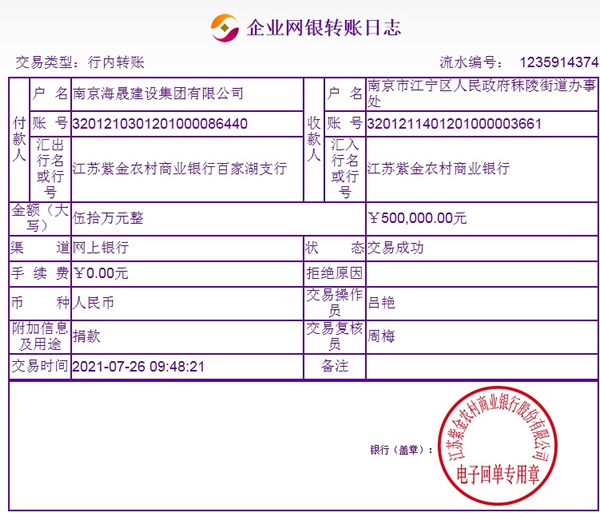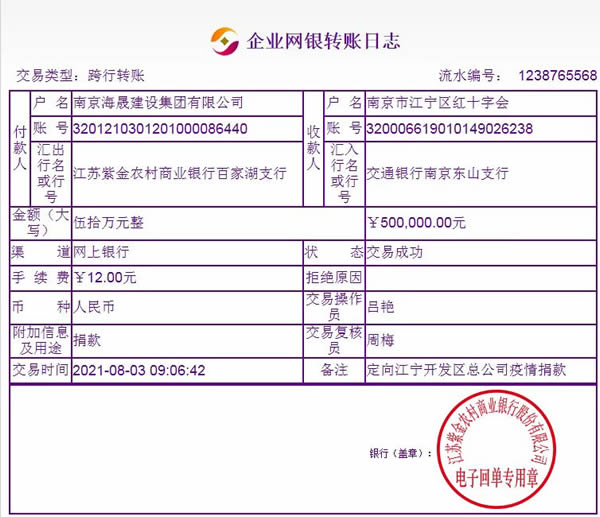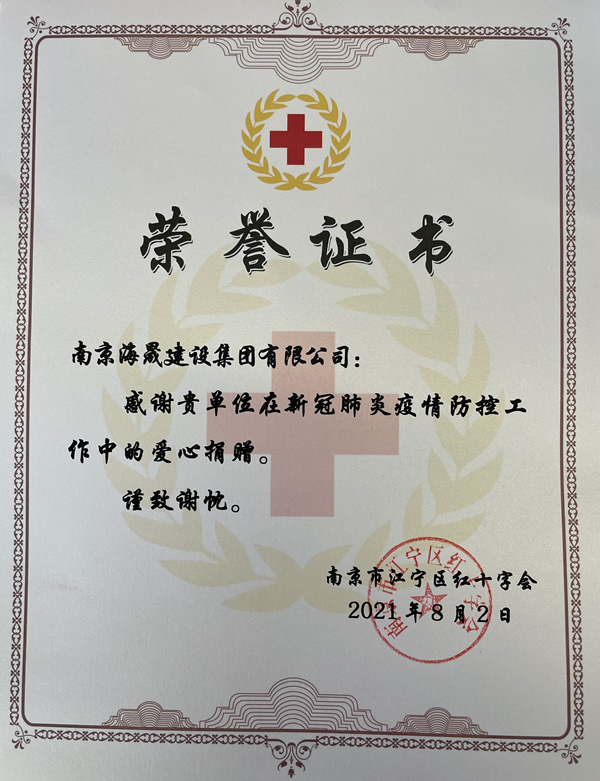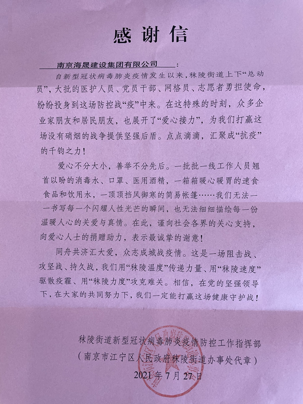 2021年7月26日,南京海晟建设集团向江宁区人民政府秣陵街道办事处捐赠人民币伍拾万元整,8月2日,向江宁区红十字会捐赠人民币伍拾万元整 ,为当前的疫情防控工作贡献我们的绵薄之力。